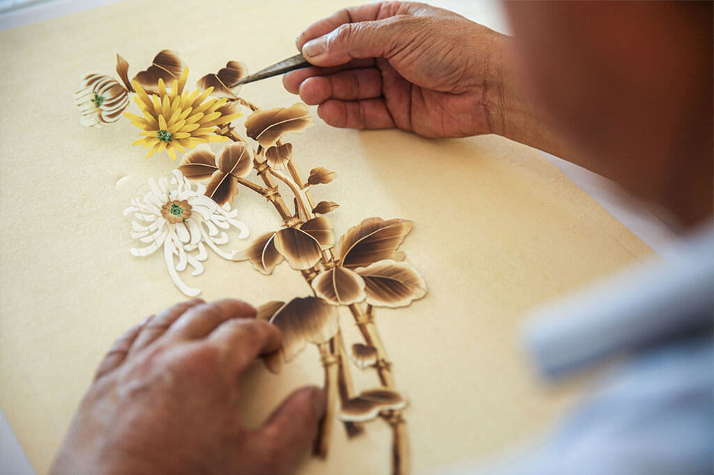 麥草畫(huà)始于隋唐時(shí)代的宮廷工藝品,是以麥秸稈為造型原料,運(yùn)用麥稈的自然光澤和紋理、質(zhì)地,創(chuàng)造性融入國(guó)畫(huà)、油畫(huà)等諸多技術(shù)技法,經(jīng)過(guò)熏、蒸、漂等三十多道工序純手工制作而成。2011年,泊里“麥草畫(huà)”入選“國(guó)禮作品選”,2018年被確定為上合青島峰會(huì)國(guó)禮贈(zèng)送各國(guó)領(lǐng)導(dǎo)人。
